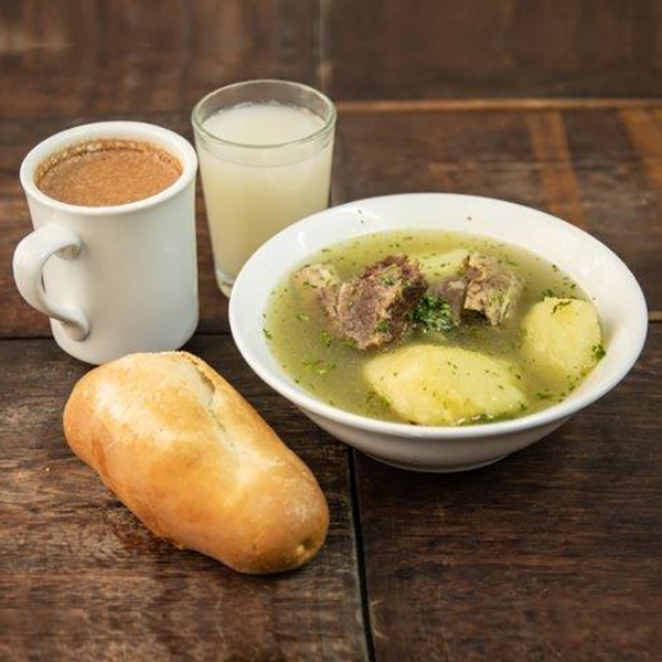 Caldo, Café, Chocolate o té, Pan, Mantequilla y Jugo.