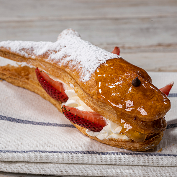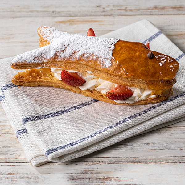 Harina, hojaldre, azúcar, crema de leche, fresa y brillo.